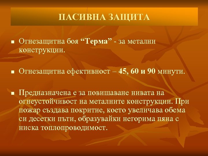 ПАСИВНА ЗАЩИТА n n n Огнезащитна боя “Терма” - за метални конструкции. Огнезащитна ефективност – 45, 60 и 90 минути. Предназначена е за повишаване нивата на огнеустойчивост на металните конструкции. При пожар създава покритие, което увеличава обема си десетки пъти, образувайки негорима пяна с ниска топлопроводимост.