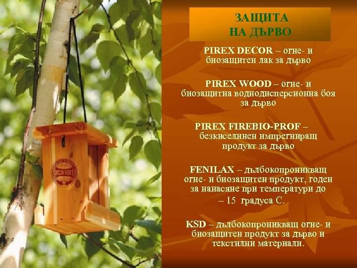 ЗАЩИТА НА ДЪРВО PIREX DECOR – огне- и биозащитен лак за дърво PIREX WOOD – огне- и биозащитна воднодисперсионна боя за дърво PIREX FIREBIO-PROF – безкиселинен импрегниращ продукт за дърво FENILAX – дълбокопроникващ огне- и биозащитен продукт, годен за нанасяне при температури до – 15 градуса С. KSD – дълбокопроникващ огне- и биозащитен продукт за дърво и текстилни материали.