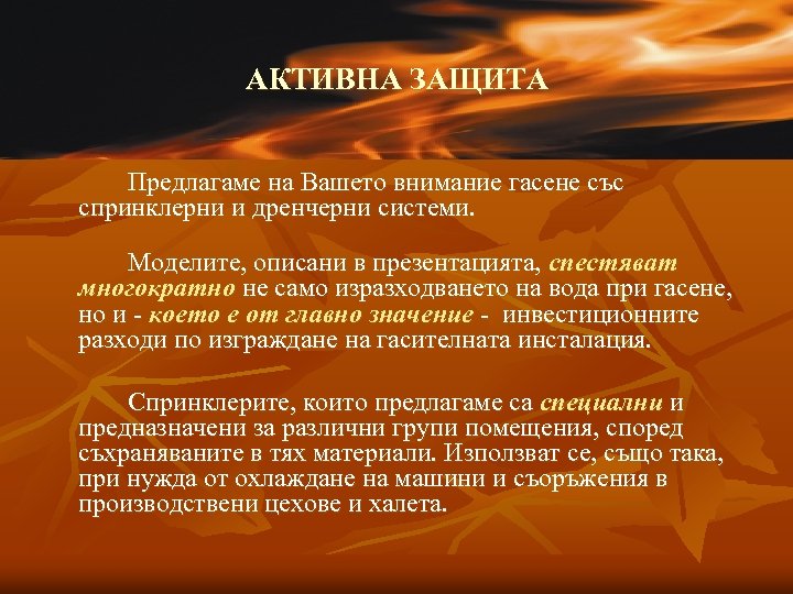 АКТИВНА ЗАЩИТА Предлагаме на Вашето внимание гасене със спринклерни и дренчерни системи. Моделите, описани в презентацията, спестяват многократно не само изразходването на вода при гасене, но и - което е от главно значение - инвестиционните разходи по изграждане на гасителната инсталация. Спринклерите, които предлагаме са специални и предназначени за различни групи помещения, според съхраняваните в тях материали. Използват се, също така, при нужда от охлаждане на машини и съоръжения в производствени цехове и халета.