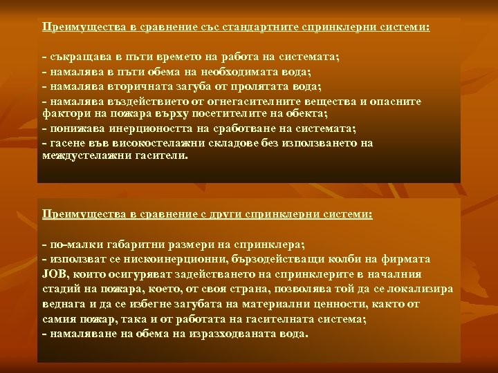 Преимущества в сравнение със стандартните спринклерни системи: - съкращава в пъти времето на работа на системата; - намалява в пъти обема на необходимата вода; - намалява вторичната загуба от пролятата вода; - намалява въздействието от огнегасителните вещества и опасните фактори на пожара върху посетителите на обекта; - понижава инерциоността на сработване на системата; - гасене във високостелажни складове без използването на междустелажни гасители. Преимущества в сравнение с други спринклерни системи: - по-малки габаритни размери на спринклера; - използват се нискоинерционни, бързодействащи колби на фирмата JOB, които осигуряват задействането на спринклерите в началния стадий на пожара, което, от своя страна, позволява той да се локализира веднага и да се избегне загубата на материални ценности, както от самия пожар, така и от работата на гасителната система; - намаляване на обема на изразходваната вода.