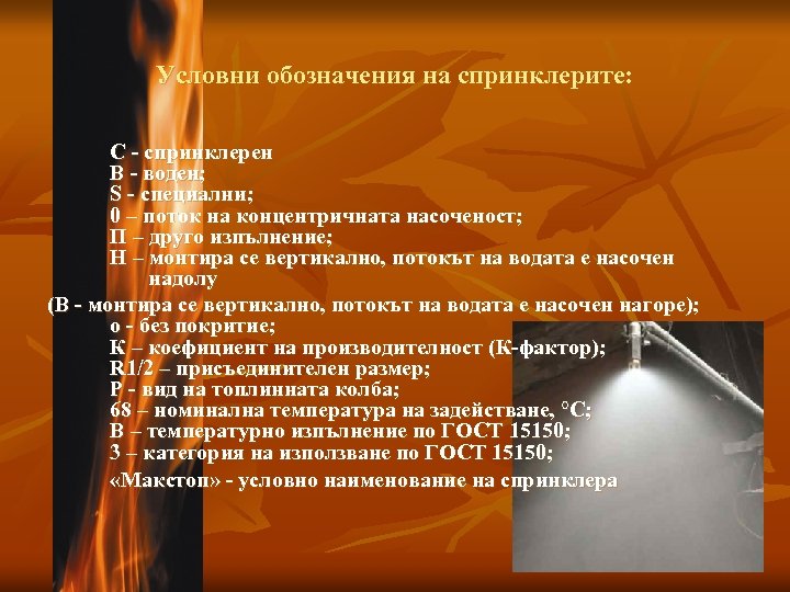Условни обозначения на спринклерите: С - спринклерен В - воден; S - специални; 0 – поток на концентричната насоченост; П – друго изпълнение; Н – монтира се вертикално, потокът на водата е насочен надолу (В - монтира се вертикално, потокът на водата е насочен нагоре); о - без покритие; К – коефициент на производителност (К-фактор); R 1/2 – присъединителен размер; Р - вид на топлинната колба; 68 – номинална температура на задействане, °С; В – температурно изпълнение по ГОСТ 15150; 3 – категория на използване по ГОСТ 15150; «Макстоп» - условно наименование на спринклера