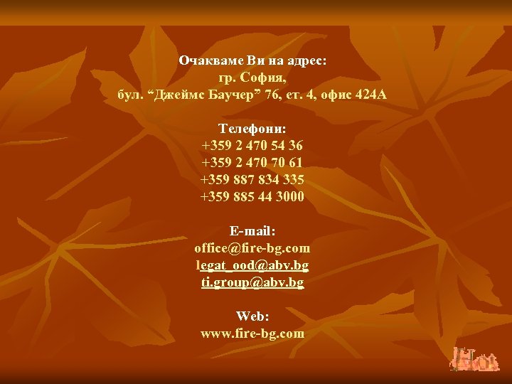 Очакваме Ви на адрес: гр. София, бул. “Джеймс Баучер” 76, ет. 4, офис 424 А Телефони: +359 2 470 54 36 +359 2 470 70 61 +359 887 834 335 +359 885 44 3000 E-mail: office@fire-bg. com legat_ood@abv. bg ti. group@abv. bg Web: www. fire-bg. com