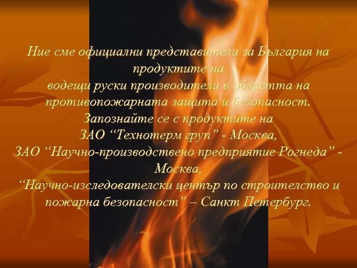 Ние сме официални представители за България на продуктите на водещи руски производители в областта на противопожарната защита и безопасност. Запознайте се с продуктите на ЗАО “Технотерм груп” - Москва, ЗАО “Научно-производствено предприятие Рогнеда” Москва, “Научно-изследователски център по строителство и пожарна безопасност” – Санкт Петербург.