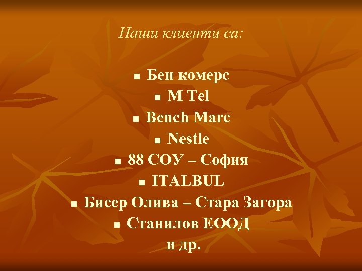 Наши клиенти са: Бен комерс n M Tel n Bench Marc n Nestle n 88 СОУ – София n ITALBUL Бисер Олива – Стара Загора n Станилов ЕООД и др. n n