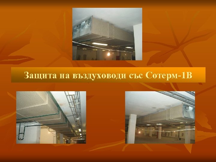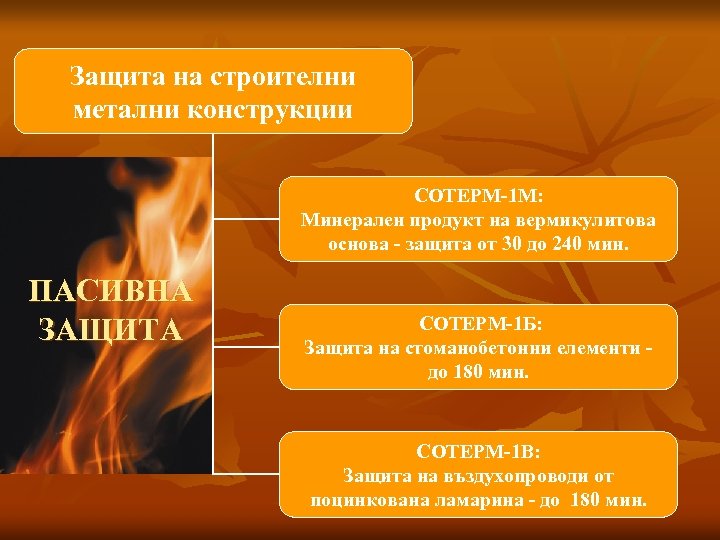 Защита на строителни метални конструкции СОТЕРМ-1 М: Минерален продукт на вермикулитова основа - защита от 30 до 240 мин. ПАСИВНА ЗАЩИТА СОТЕРМ-1 Б: Защита на стоманобетонни елементи до 180 мин. СОТЕРМ-1 В: Защита на въздухопроводи от поцинкована ламарина - до 180 мин.