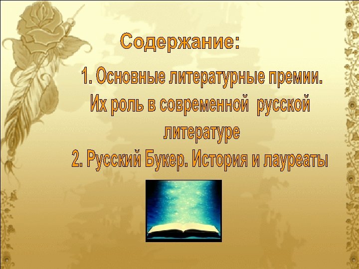 Краткая история Название премии никак не связано с книгой – «book» . Торговая компания Букер, чье имя носят теперь Британская и русская премии, была основана в Ливерпуле двести лет назад братьями Букер. В середине прошлого века глава компании приобрёл авторские права у своего друга Яна Флеминга, затем права на издание своих книг продала компании Агата Кристи и некоторые другие британские писатели. Книжный бизнес оказался очень выгодным делом, и, заработав на литературе, компания решила поделиться с литературой своими доходами. Так в 1969 году появилась Букеровская премия. Она стала основной литературной премией Великобритании. Среди её лауреатов Айрис Мердок, Уильям Голдинг, Кингсли Эмис, Салман Рушди, Бен Окри, Кадзуо Ишигуро, Грэм Свифт: Первым дважды лауреатом премии стал южноафриканский прозаик Дж. М. Кутзее, получивший затем и Нобелевскую премию. В начале 90 -х годов, когда казалось, что русская литература находится под угрозой исчезновения, одна национальная культура, прославленная в жанре романа, - английская, пришла на помощь другой культуре, прославленной в этом же жанре, - русской, и помогла учредить премию за лучший роман года, написанный на русском языке. Так в 1992 году англичанами был создан «Русский Букер» - первая с 1917 года негосударственная литературная премия. Сначала в организации премии большое участие принимал Британский совет в Москве. . С 1997 года премия изменила свое название на "Smirnoff-Букер" по имени Фонда памяти П. А. Смирнова. С 2002 по 2005 год премия носила название "Букер - Открытая Россия", а ее спонсором выступала Межрегиональная благотворительная организация "Открытая Россия", созданная на деньги владельцев компании "ЮКОС". С 2006 года попечителем премии стала международная нефтегазовая компания BP. Руководство осуществляется Букеровским комитетом, куда входят писатели, критики, историки, журналисты. С 1999 г. комитет возглавляет литературовед и критик Игорь Шайтанов. Комитет избирает ежегодно сменяемое жюри из пяти человек, которые отбирают произведения, формируя вначале шорт-лист (список финалистов), а затем объявляет победителя. Подробнее смотри: 1. Сайт премии «Русский Букер» : http: //www. russianbooker. org/ 2. «Студенческий Букер»