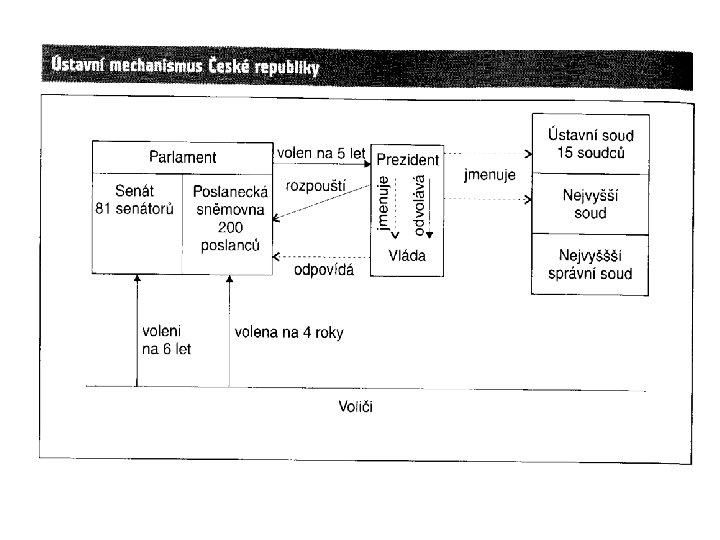 Parlamentní systémy • svrchovanost parlamentu (má svrchované postavení mezi ostatními státními orgány, má zákonodárnou a kontrolní funkci vůči vládní a výkonné moci) • princip sdílení moci Z principu sdílené moci vycházejí tři koncepty vztahu premiéra k vládě: a) první nad nerovnými (Británie) b) první mezi nerovnými c) první mezi rovnými (ČR) Hlava státu (prezident, případně král) má v tomto systému jen reprezentativní postavení a nemá mnoho pravomocí (reprezentuje stát v zahraničí, jmenuje vládu a sjednává a podepisuje mezinárodní dohody a může např. udělovat amnestie)