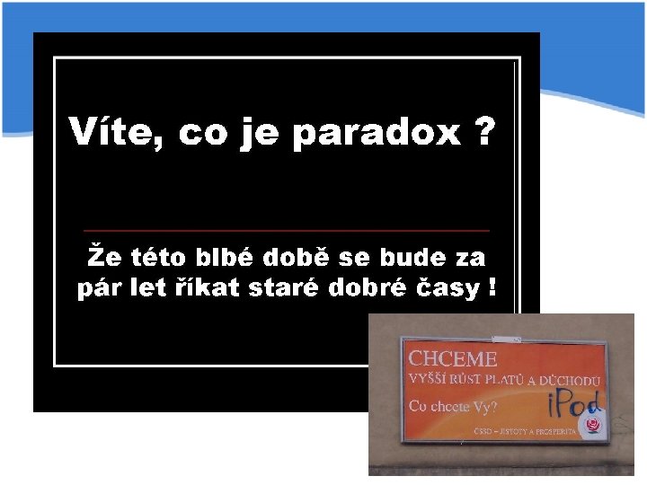 Paroubkova rovnost Jdou Topolánek s Paroubkem po silnici a najednou jim cestu zkříží had. Topolánek hned přiskočí a hada zabije. Paroubek na to : "Co jsi to udělal? Nemůžeš zničit každého, kdo se nám postaví do cesty. Je demokracie a každý má právo jít svojí vlastní cestou. „ Jdou dál a najednou začne před nimi poskakovat žába. Paroubek zrychlí a jediným šlápnutím ji rozmáčkne na kaši. Topolánek nechápavě kroutí hlavou: "Ale před chvílí jsi povídal, že každý může jít svou vlastní cestou, ne. . . ? „ Paroubek: " To ano, ale mají se plazit a ne si vyskakovat!!!"