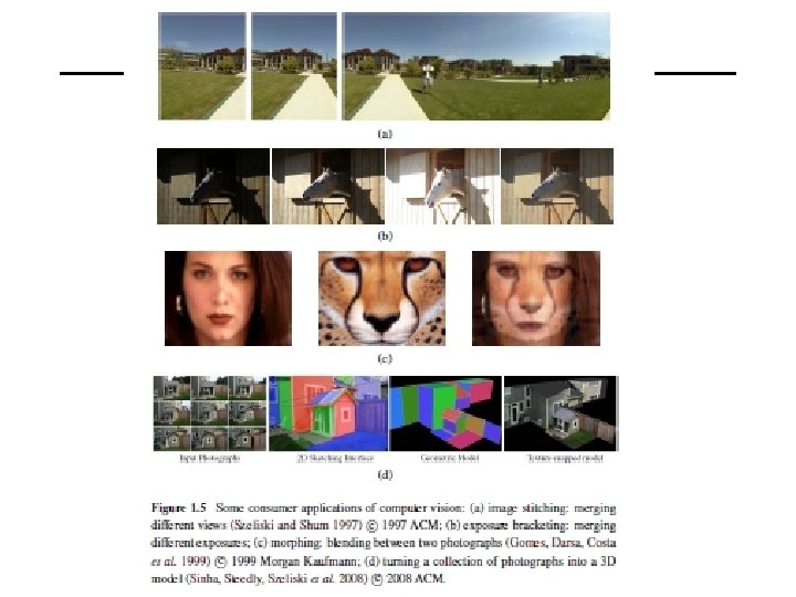 Consumer-Level Applications • Stitching: turning overlapping photos into a single seamlessly stitched panorama (Figure 1. 5 a), as described in Chapter 9; • Exposure bracketing: merging multiple exposures taken under challenging lighting conditions (strong sunlight and shadows) into a single perfectly exposed image (Figure 1. 5 b), as described in Section 10. 2; • Morphing: turning a picture of one of your friends into another, using a seamless morph transition (Figure 1. 5 c);