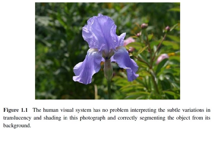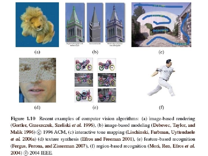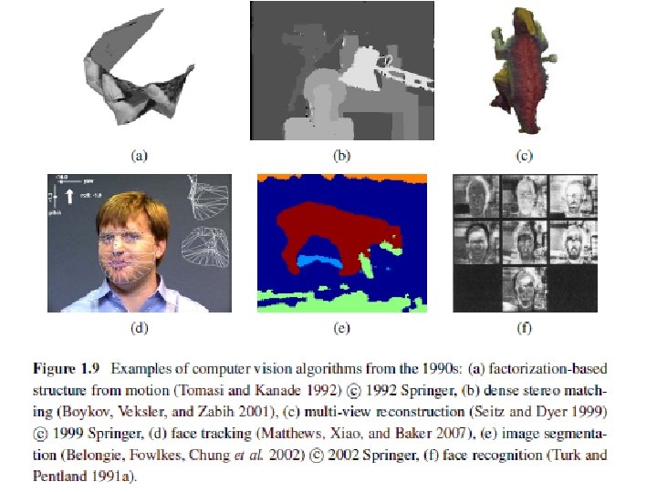1. 1 What Is Computer Vision? • Match move: merging computer-generated imagery (CGI) with live action footage by tracking feature points in the source video to estimate the 3 D camera motion and shape of the environment. • Such techniques are widely used in Hollywood (e. g. , in movies such as Jurassic Park) (Roble 1999; Roble and Zafar 2009); • They also require the use of precise matting to insert new elements between foreground and background elements (Chuang, Agarwala, Curless et al. 2002).