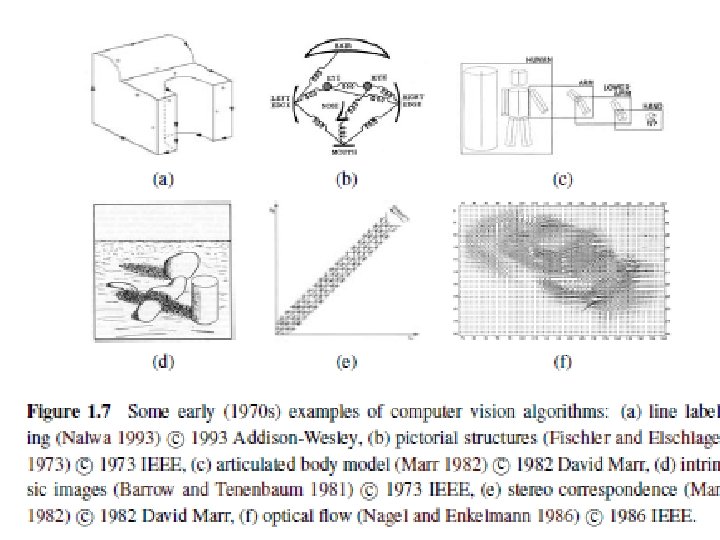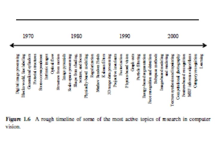 1. 2 A Brief History • Hardware implementation: How are the representations and algorithms mapped onto actual hardware, e. g. , a biological vision system or a specialized piece of silicon? • Conversely, how can hardware constraints be used to guide the choice of representation and algorithm? • With the increasing use of graphics chips (GPUs) and many-core architectures for computer vision (see Section C. 2), this question is again becoming quite relevant.