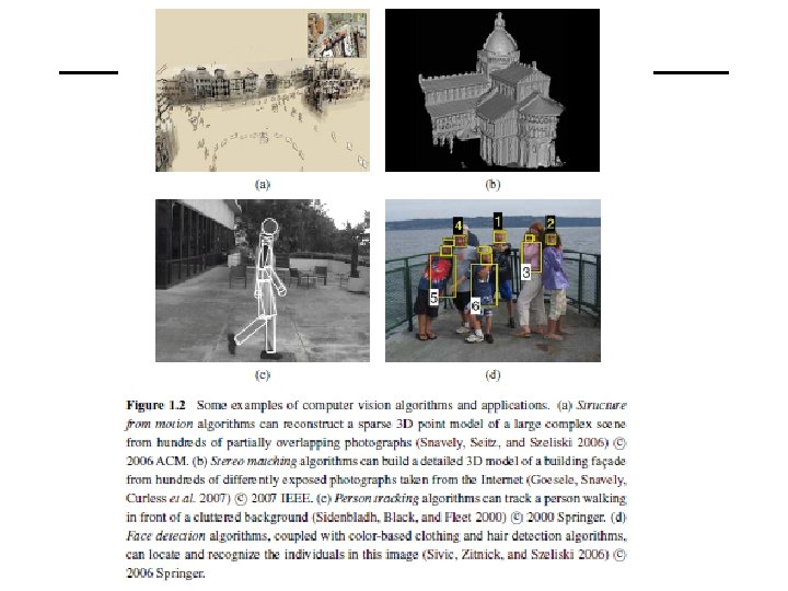 • 3 D modeling: converting one or more snapshots into a 3 D model of the object or person you are photographing (Figure 1. 5 d), as described in Section 12. 6 • Video match move and stabilization: inserting 2 D pictures or 3 D models into your videos by automatically tracking nearby reference points (see Section 7. 4. 2) or using motion estimates to remove shake from your videos (see Section 8. 2. 1);