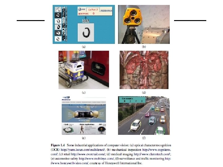 1. 1 What Is Computer Vision? • Optical character recognition (OCR): reading handwritten postal codes on letters (Figure 1. 4 a) and automatic number plate recognition (ANPR); • Machine inspection: rapid parts inspection for quality assurance using stereo vision with specialized illumination to measure tolerances on aircraft wings or auto body parts (Figure 1. 4 b) or looking for defects in steel castings using X-ray vision; • Retail: object recognition for automated checkout lanes (Figure 1. 4 c); • 3 D model building (photogrammetry): fully automated construction of 3 D models from aerial photographs used
