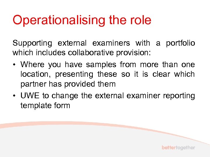 Operationalising the role Supporting external examiners with a portfolio which includes collaborative provision: • Where you have samples from more than one location, presenting these so it is clear which partner has provided them • UWE to change the external examiner reporting template form