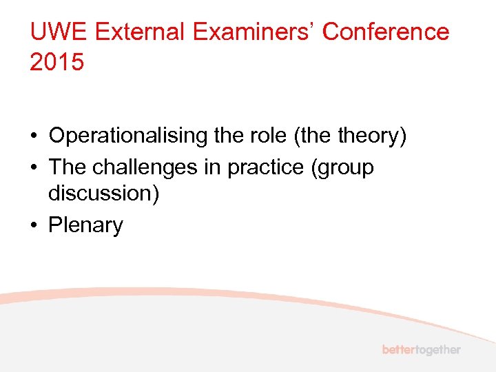 UWE External Examiners’ Conference 2015 • Operationalising the role (the theory) • The challenges in practice (group discussion) • Plenary