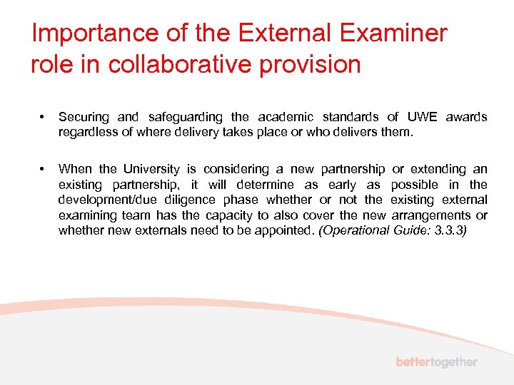 Importance of the External Examiner role in collaborative provision • Securing and safeguarding the academic standards of UWE awards regardless of where delivery takes place or who delivers them. • When the University is considering a new partnership or extending an existing partnership, it will determine as early as possible in the development/due diligence phase whether or not the existing external examining team has the capacity to also cover the new arrangements or whether new externals need to be appointed. (Operational Guide: 3. 3. 3)
