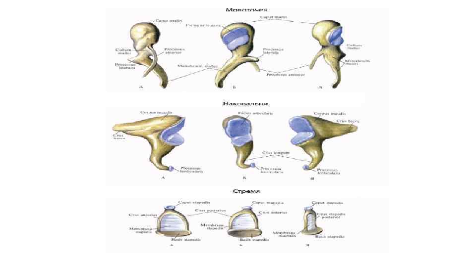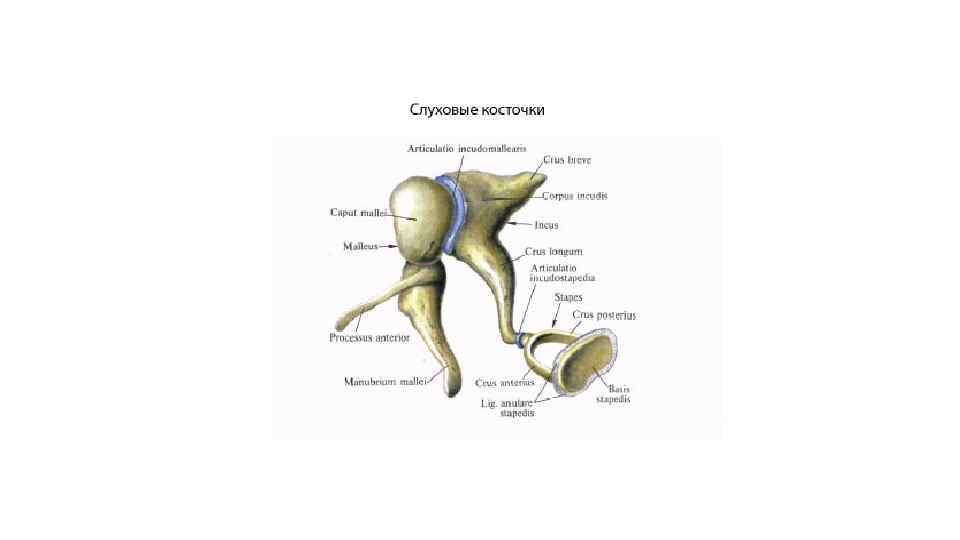 Находящиеся в барабанной полости три маленькие слуховые косточки носят по своему виду названия молоточка, наковальни и стремени. 1. Молоточек, malleus, снабжен округлой головкой, caput mallei, которая при посредстве шейки, collum mallei, соединяется с рукояткой, manubrium mallei. 2. Наковальня, incus, имеет тело, corpus incudis, и два расходящихся отростка, из которых один более короткий, cms breve, направлен назад и упирается в ямку, а другой - длинный отросток, crus longum, идет параллельно рукоятке молоточка медиально и кзади от нее и на своем конце имеет небольшое овальное утолщение, processus lenticularis, сочленяющееся со стременем. 3. Стремя, stapes, по своей форме оправдывает свое название и состоит из маленькой головки, caput stapedis, несущей сочленовную поверхность для processus lenticularis наковальни и двух ножек: передней, более прямой, crus anterius, и задней, более изогнутой, crus posterius, которые соединяются с овальной пластинкой, basis stapedis, вставленной в окно преддверия.