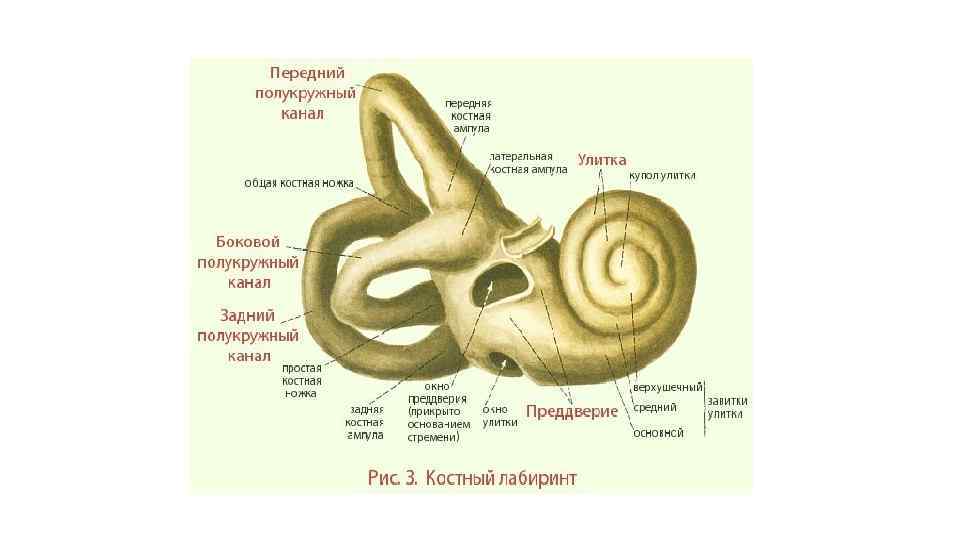 Внутреннее ухо, или лабиринт, располагается в толще пирамиды височной кости между барабанной полостью и внутренним слуховым проходом, через который выходит из лабиринта n. vestibulocochlearis. Различают костный и перепончатый лабиринты, причем последний лежит внутри первого. Костный лабиринт, labyrinthus osseus, представляет ряд мелких сообщающихся между собой полостей, стенки которых состоят из компактной кости. В нем различают три отдела: преддверие, полукружные каналы и улитку; улитка лежит спереди, медиально и несколько книзу от преддверия, а полукружные каналы - кзади, латерально и кверху от него.