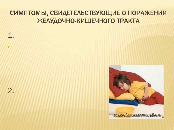 СИМПТОМЫ, СВИДЕТЕЛЬСТВУЮЩИЕ О ПОРАЖЕНИИ ЖЕЛУДОЧНО-КИШЕЧНОГО ТРАКТА 1. • 2.