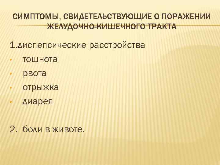 СИМПТОМЫ, СВИДЕТЕЛЬСТВУЮЩИЕ О ПОРАЖЕНИИ ЖЕЛУДОЧНО-КИШЕЧНОГО ТРАКТА 1. диспепсические расстройства • тошнота • рвота • отрыжка • диарея 2. боли в животе.