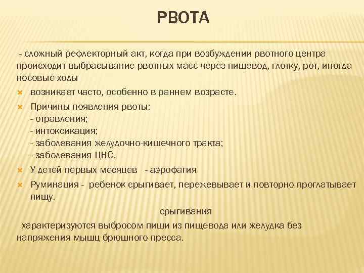 РВОТА - сложный рефлекторный акт, когда при возбуждении рвотного центра происходит выбрасывание рвотных масс через пищевод, глотку, рот, иногда носовые ходы возникает часто, особенно в раннем возрасте. Причины появления рвоты: - отравления; - интоксикация; - заболевания желудочно-кишечного тракта; - заболевания ЦНС. У детей первых месяцев - аэрофагия Руминация - ребенок срыгивает, пережевывает и повторно проглатывает пищу. срыгивания характеризуются выбросом пищи из пищевода или желудка без напряжения мышц брюшного пресса.