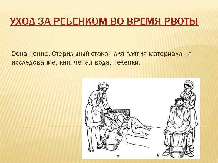 УХОД ЗА РЕБЕНКОМ ВО ВРЕМЯ РВОТЫ Оснащение. Стерильный стакан для взятия материала на исследование, кипяченая вода, пеленки.