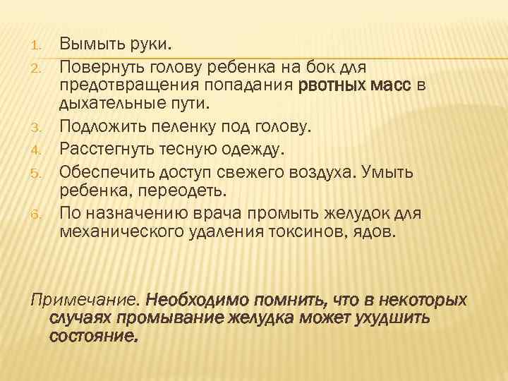 1. Вымыть руки. 2. Повернуть голову ребенка на бок для предотвращения попадания рвотных масс в дыхательные пути. 3. Подложить пеленку под голову. 4. Расстегнуть тесную одежду. 5. Обеспечить доступ свежего воздуха. Умыть ребенка, переодеть. 6. По назначению врача промыть желудок для механического удаления токсинов, ядов. Примечание. Необходимо помнить, что в некоторых случаях промывание желудка может ухудшить состояние.