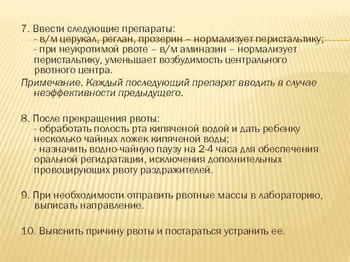 7. Ввести следующие препараты: - в/м церукал, реглан, прозерин – нормализует перистальтику; - при неукротимой рвоте – в/м аминазин – нормализует перистальтику, уменьшает возбудимость центрального рвотного центра. Примечание. Каждый последующий препарат вводить в случае неэффективности предыдущего. 8. После прекращения рвоты: - обработать полость рта кипяченой водой и дать ребенку несколько чайных ложек кипяченой воды; - назначить водно-чайную паузу на 2 -4 часа для обеспечения оральной регидратации, исключения дополнительных провоцирующих рвоту раздражителей. 9. При необходимости отправить рвотные массы в лабораторию, выписать направление. 10. Выяснить причину рвоты и постараться устранить ее.