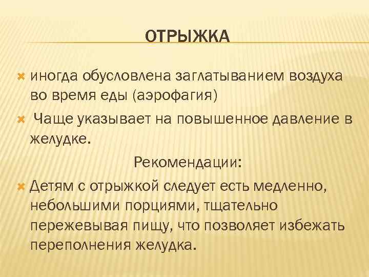 ОТРЫЖКА иногда обусловлена заглатыванием воздуха во время еды (аэрофагия) Чаще указывает на повышенное давление в желудке. Рекомендации: Детям с отрыжкой следует есть медленно, небольшими порциями, тщательно пережевывая пищу, что позволяет избежать переполнения желудка.