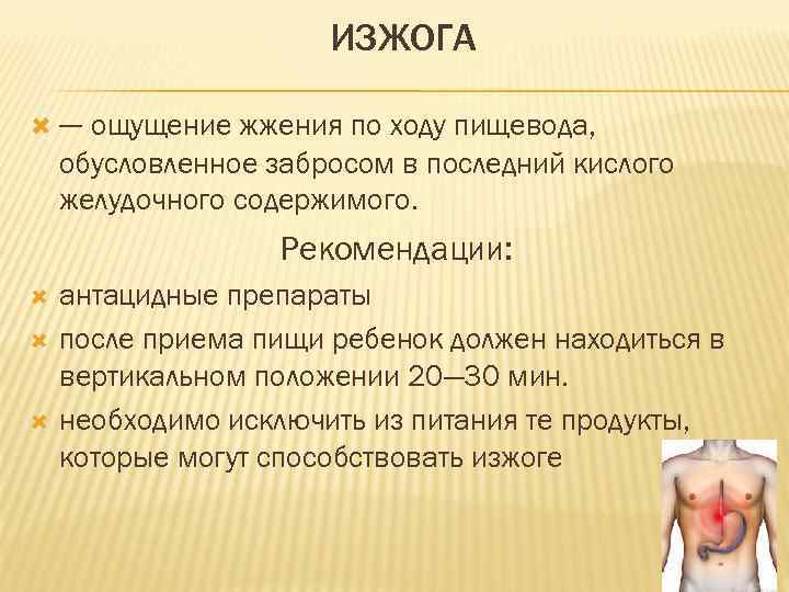 ИЗЖОГА — ощущение жжения по ходу пищевода, обусловленное забросом в последний кислого желудочного содержимого. Рекомендации: антацидные препараты после приема пищи ребенок должен находиться в вертикальном положении 20— 30 мин. необходимо исключить из питания те продукты, которые могут способствовать изжоге
