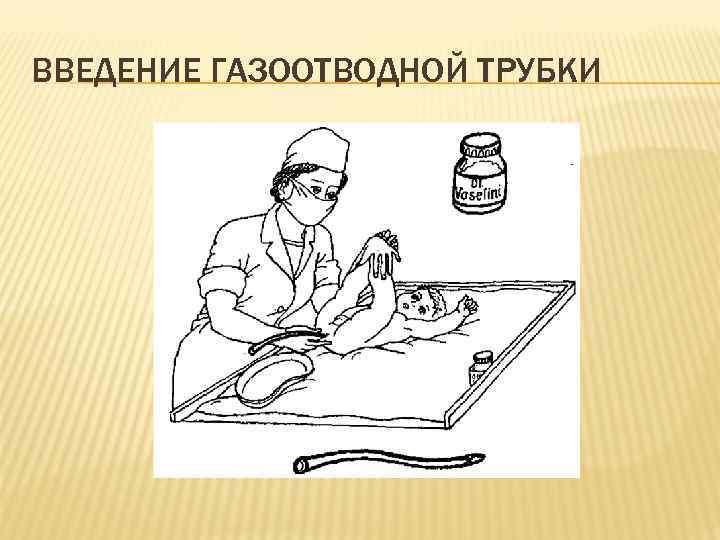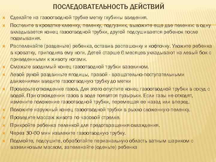 ПОСЛЕДОВАТЕЛЬНОСТЬ ДЕЙСТВИЙ Сделайте на газоотводной трубке метку глубины введения. Постелите в кроватке клеенку, пеленку, подгузник, выложите еще две пеленки: в одну вкладывается конец газоотводной трубки, другой подсушивается ребенок после подмывания. Распеленайте (разденьте) ребенка, оставив распашонку и кофточку. Уложите ребенка в кроватку, приподняв ему ноги. Детей старше 6 месяцев укладывают на левый бок с приведенными к животу ногами. Смажьте вводимый конец газоотводной трубки вазелином. Левой рукой раздвиньте ягодицы, правой - вращательно-поступательными движениями введите газоотводную трубку до метки Проверьте отхождение газов. Для этого опустите конец газоотводной трубки в сосуд с водой. При отхождении газов в воде появятся пузырьки. Если газы не отходят, измените положение газоотводной трубки, перемещая ее назад или вперед. Положите наружный конец газоотводной трубки в рыхло сложенную пеленку. Проведите массаж живота по часовой стрелке. Прикройте ребенка пеленкой для предотвращения охлаждения. Через 30 -60 мин извлеките газоотводную трубку. Подмойте, подсушите, обработайте перианальную область ватным шариком с вазелиновым маслом, запеленайте (оденьте) ребенка