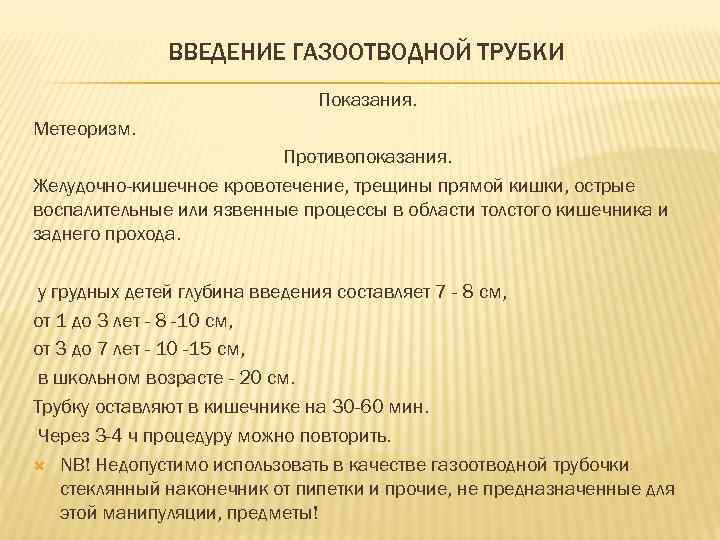 ВВЕДЕНИЕ ГАЗООТВОДНОЙ ТРУБКИ Показания. Метеоризм. Противопоказания. Желудочно-кишечное кровотечение, трещины прямой кишки, острые воспалительные или язвенные процессы в области толстого кишечника и заднего прохода. у грудных детей глубина введения составляет 7 - 8 см, от 1 до 3 лет - 8 -10 см, от 3 до 7 лет - 10 -15 см, в школьном возрасте - 20 см. Трубку оставляют в кишечнике на 30 -60 мин. Через 3 -4 ч процедуру можно повторить. NB! Недопустимо использовать в качестве газоотводной трубочки стеклянный наконечник от пипетки и прочие, не предназначенные для этой манипуляции, предметы!