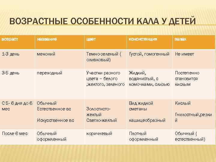 ВОЗРАСТНЫЕ ОСОБЕННОСТИ КАЛА У ДЕТЕЙ возраст название цвет консистенция запах 1 -3 день меконий Темно-зеленый ( Густой, гомогенный Не имеет оливковый) 3 -5 день переходный Участки разного Жидкий, Постепенно цвета – белого водянистый, с становится , желтого, зеленого комочками, слизью кислым С 5 - 6 дня до 6 Обычный Вид жидкой Кислый мес Естественное вс Золостисто- сметаны желтый Гнилостный, резки Искусственное вс Светло-желтый кашицеобразный й После 6 мес Обычный коричневый Плотный Обычный ( оформленный естественный)