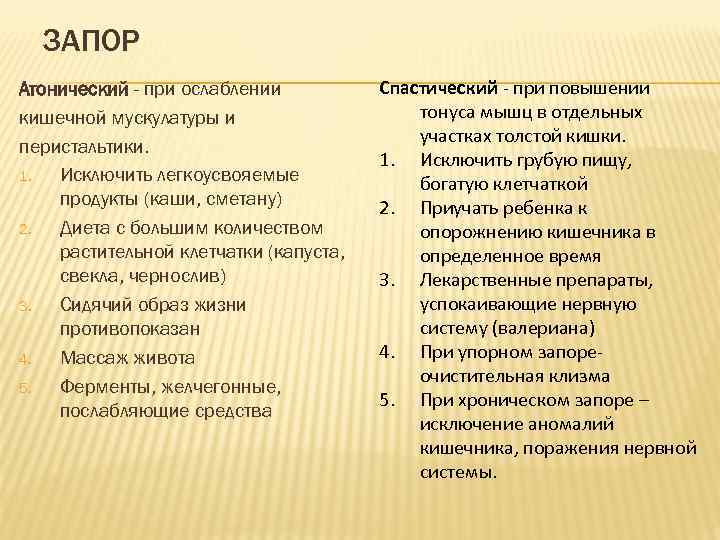ЗАПОР Атонический - при ослаблении Спастический - при повышении кишечной мускулатуры и тонуса мышц в отдельных участках толстой кишки. перистальтики. 1. Исключить грубую пищу, 1. Исключить легкоусвояемые богатую клетчаткой продукты (каши, сметану) 2. Приучать ребенка к 2. Диета с большим количеством опорожнению кишечника в растительной клетчатки (капуста, определенное время свекла, чернослив) 3. Лекарственные препараты, 3. Сидячий образ жизни успокаивающие нервную противопоказан систему (валериана) 4. Массаж живота 4. При упорном запоре- очистительная клизма 5. Ферменты, желчегонные, 5. При хроническом запоре – послабляющие средства исключение аномалий кишечника, поражения нервной системы.