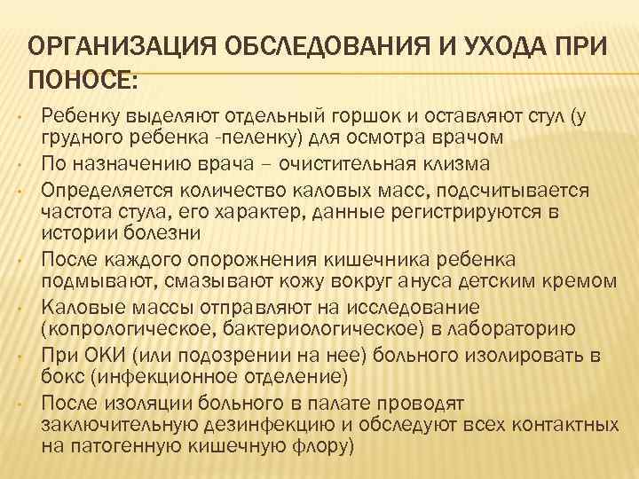 ОРГАНИЗАЦИЯ ОБСЛЕДОВАНИЯ И УХОДА ПРИ ПОНОСЕ: • Ребенку выделяют отдельный горшок и оставляют стул (у грудного ребенка -пеленку) для осмотра врачом • По назначению врача – очистительная клизма • Определяется количество каловых масс, подсчитывается частота стула, его характер, данные регистрируются в истории болезни • После каждого опорожнения кишечника ребенка подмывают, смазывают кожу вокруг ануса детским кремом • Каловые массы отправляют на исследование (копрологическое, бактериологическое) в лабораторию • При ОКИ (или подозрении на нее) больного изолировать в бокс (инфекционное отделение) • После изоляции больного в палате проводят заключительную дезинфекцию и обследуют всех контактных на патогенную кишечную флору)