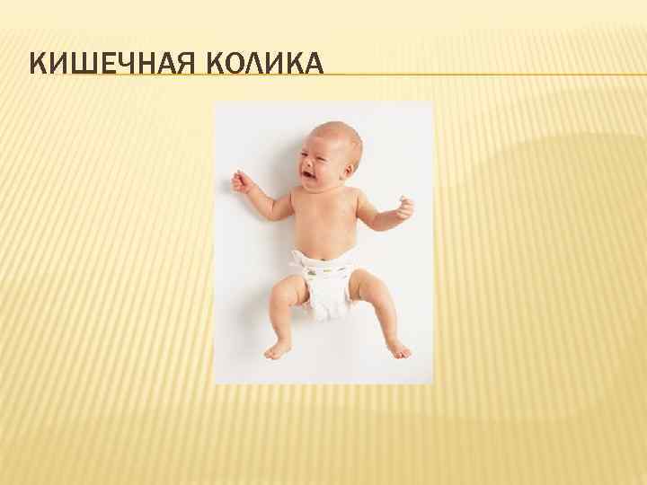 КИШЕЧНАЯ КОЛИКА Приступообразные боли в животе Причины: • Морфофункциональная незрелость периферической иннервации кишечника • Дисфункция центральной регуляции • Поздний старт ферментативний системы • Нарушение становления биоценоза кишечника