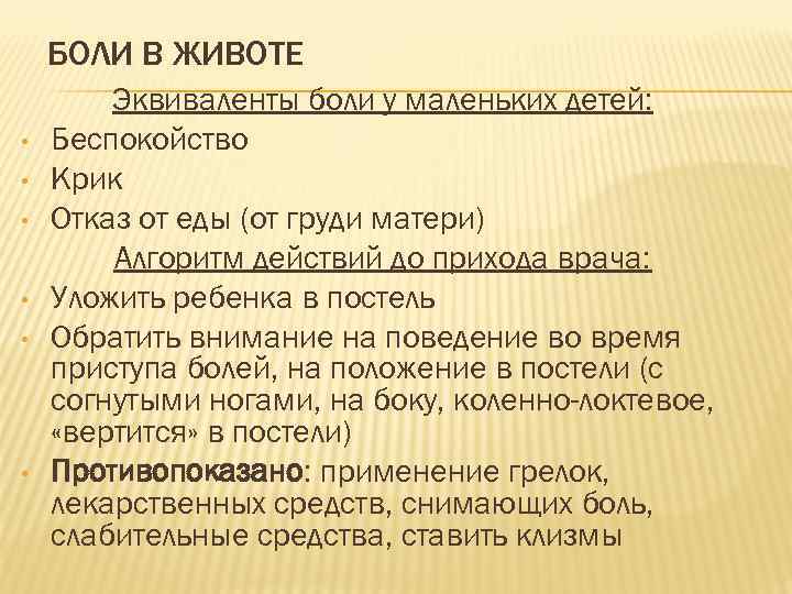 БОЛИ В ЖИВОТЕ Эквиваленты боли у маленьких детей: • Беспокойство • Крик • Отказ от еды (от груди матери) Алгоритм действий до прихода врача: • Уложить ребенка в постель • Обратить внимание на поведение во время приступа болей, на положение в постели (с согнутыми ногами, на боку, коленно-локтевое, «вертится» в постели) • Противопоказано: применение грелок, лекарственных средств, снимающих боль, слабительные средства, ставить клизмы