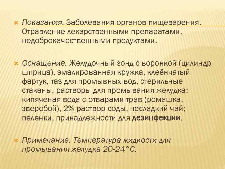 Показания. Заболевания органов пищеварения. Отравление лекарственными препаратами, недоброкачественными продуктами. Оснащение. Желудочный зонд с воронкой (цилиндр шприца), эмалированная кружка, клеёнчатый фартук, таз для промывных вод, стерильные стаканы, растворы для промывания желудка: кипяченая вода с отварами трав (ромашка, зверобой), 2% раствор соды, несладкий чай; пеленки, принадлежности для дезинфекции. Примечание. Температура жидкости для промывания желудка 20 -24°С.