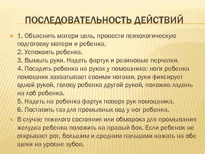 ПОСЛЕДОВАТЕЛЬНОСТЬ ДЕЙСТВИЙ 1. Объяснить матери цель, провести психологическую подготовку матери и ребенка. 2. Успокоить ребенка. 3. Вымыть руки. Надеть фартук и резиновые перчатки. 4. Посадить ребенка на руках у помощника: ноги ребенка помощник захватывает своими ногами, руки фиксирует одной рукой, голову ребенка другой рукой, положив ладонь на лоб ребенка. 5. Надеть на ребенка фартук поверх рук помощника. 6. Поставить таз для промывных вод у ног ребенка. В случае тяжелого состояния или обморока для промывания желудка ребенка положить на правый бок. Если ребенок не открывает рот, большим и средним пальцами нажать на обе щеки на уровне зубов.