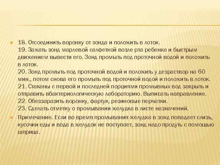 18. Отсоединить воронку от зонда и положить в лоток. 19. Зажать зонд марлевой салфеткой возле рта ребенка и быстрым движением вывести его. Зонд промыть под проточной водой и положить в лоток. 20. Зонд промыть под проточной водой и положить у дезраствор на 60 мин. , потом снова его промыть под проточной водой и положить в лоток. 21. Стаканы с первой и последней порциями промывных вод закрыть и отправить вбактериологическую лабораторию. Выписать направление. 22. Обеззаразить воронку, фартук, резиновые перчатки. 23. Сделать отметку о промывании желудка в листе назначений. Примечание. Если во время промывания желудка в зонд попадает слизь, кусочки еды и вода в желудок не поступает, зонд надо продуть с помощью шприца.
