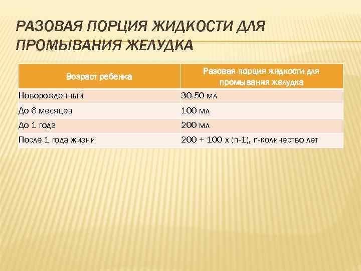 РАЗОВАЯ ПОРЦИЯ ЖИДКОСТИ ДЛЯ ПРОМЫВАНИЯ ЖЕЛУДКА Разовая порция жидкости для Возраст ребенка промывания желудка Новорожденный 30 -50 мл До 6 месяцев 100 мл До 1 года 200 мл После 1 года жизни 200 + 100 х (n-1), n-количество лет