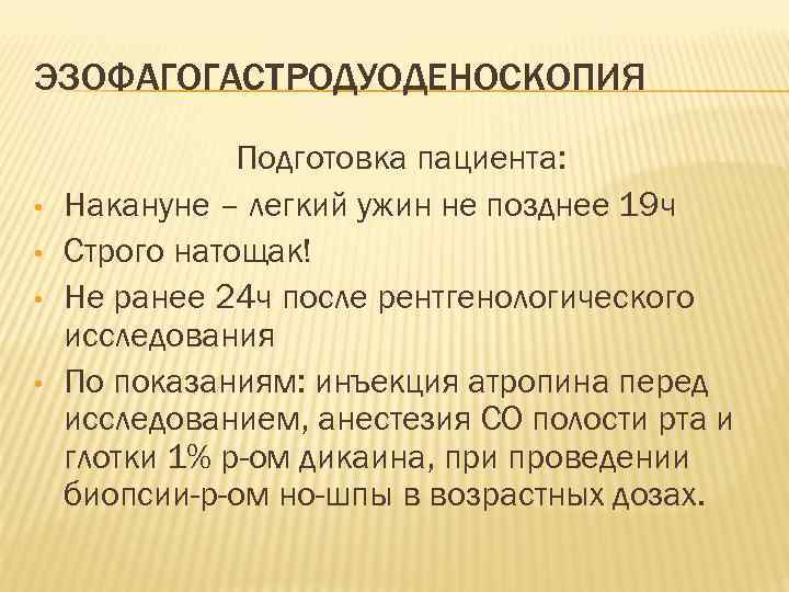 ЭЗОФАГОГАСТРОДУОДЕНОСКОПИЯ Подготовка пациента: • Накануне – легкий ужин не позднее 19 ч • Строго натощак! • Не ранее 24 ч после рентгенологического исследования • По показаниям: инъекция атропина перед исследованием, анестезия СО полости рта и глотки 1% р-ом дикаина, при проведении биопсии-р-ом но-шпы в возрастных дозах.