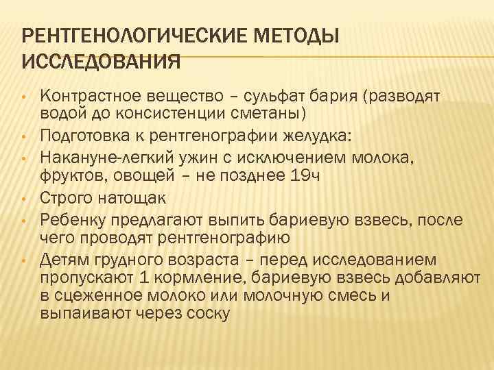 РЕНТГЕНОЛОГИЧЕСКИЕ МЕТОДЫ ИССЛЕДОВАНИЯ • Контрастное вещество – сульфат бария (разводят водой до консистенции сметаны) • Подготовка к рентгенографии желудка: • Накануне-легкий ужин с исключением молока, фруктов, овощей – не позднее 19 ч • Строго натощак • Ребенку предлагают выпить бариевую взвесь, после чего проводят рентгенографию • Детям грудного возраста – перед исследованием пропускают 1 кормление, бариевую взвесь добавляют в сцеженное молоко или молочную смесь и выпаивают через соску