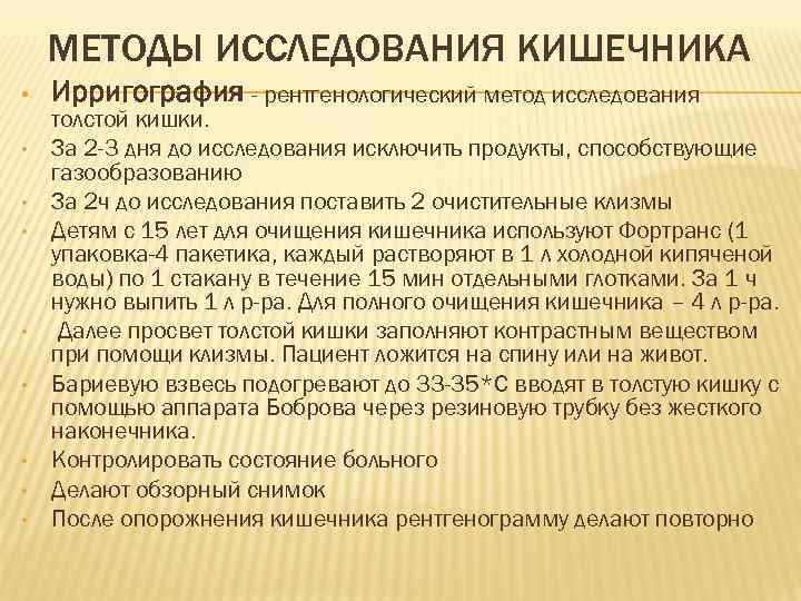 МЕТОДЫ ИССЛЕДОВАНИЯ КИШЕЧНИКА • Ирригография - рентгенологический метод исследования толстой кишки. • За 2 -3 дня до исследования исключить продукты, способствующие газообразованию • За 2 ч до исследования поставить 2 очистительные клизмы • Детям с 15 лет для очищения кишечника используют Фортранс (1 упаковка-4 пакетика, каждый растворяют в 1 л холодной кипяченой воды) по 1 стакану в течение 15 мин отдельными глотками. За 1 ч нужно выпить 1 л р-ра. Для полного очищения кишечника – 4 л р-ра. • Далее просвет толстой кишки заполняют контрастным веществом при помощи клизмы. Пациент ложится на спину или на живот. • Бариевую взвесь подогревают до 33 -35*С вводят в толстую кишку с помощью аппарата Боброва через резиновую трубку без жесткого наконечника. • Контролировать состояние больного • Делают обзорный снимок • После опорожнения кишечника рентгенограмму делают повторно