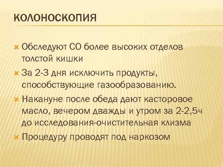 КОЛОНОСКОПИЯ Обследуют СО более высоких отделов толстой кишки За 2 -3 дня исключить продукты, способствующие газообразованию. Накануне после обеда дают касторовое масло, вечером дважды и утром за 2 -2, 5 ч до исследования-очистительная клизма Процедуру проводят под наркозом