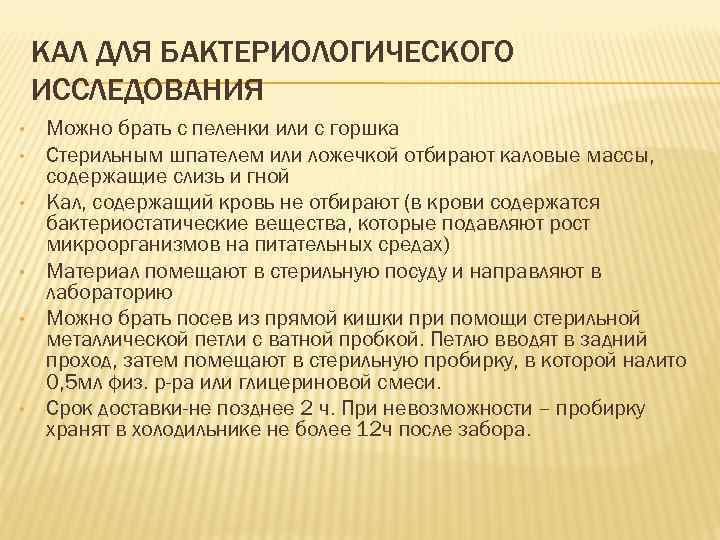 КАЛ ДЛЯ БАКТЕРИОЛОГИЧЕСКОГО ИССЛЕДОВАНИЯ • Можно брать с пеленки или с горшка • Стерильным шпателем или ложечкой отбирают каловые массы, содержащие слизь и гной • Кал, содержащий кровь не отбирают (в крови содержатся бактериостатические вещества, которые подавляют рост микроорганизмов на питательных средах) • Материал помещают в стерильную посуду и направляют в лабораторию • Можно брать посев из прямой кишки при помощи стерильной металлической петли с ватной пробкой. Петлю вводят в задний проход, затем помещают в стерильную пробирку, в которой налито 0, 5 мл физ. р-ра или глицериновой смеси. • Срок доставки-не позднее 2 ч. При невозможности – пробирку хранят в холодильнике не более 12 ч после забора.