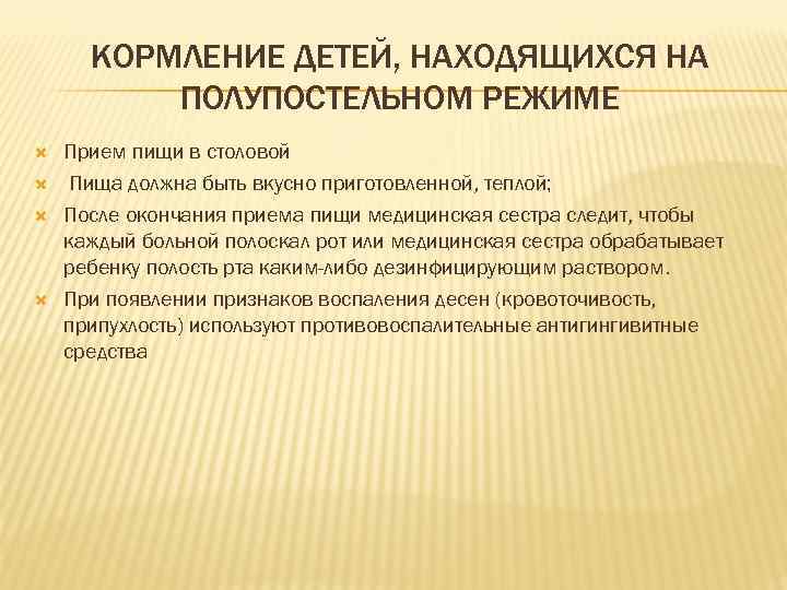 КОРМЛЕНИЕ ДЕТЕЙ, НАХОДЯЩИХСЯ НА ПОЛУПОСТЕЛЬНОМ РЕЖИМЕ Прием пищи в столовой Пища должна быть вкусно приготовленной, теплой; После окончания приема пищи медицинская сестра следит, чтобы каждый больной полоскал рот или медицинская сестра обрабатывает ребенку полость рта каким-либо дезинфицирующим раствором. При появлении признаков воспаления десен (кровоточивость, припухлость) используют противовоспалительные антигингивитные средства