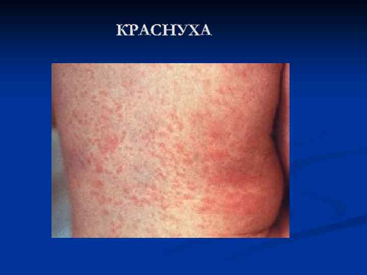 n n n Инкубационный период заболевания длится от 11 до 24 дней (чаще 16 -20). Вирус краснухи проникает в организм через слизистые оболочки дыхательных путей и разносится кровью по всему организму, вызывая увеличение лимфатических узлов, в особенности тех, что расположены на затылке и задней стороне шеи. Иногда возникает незначительный насморк и сухой кашель, чувство першения в горле, слезотечение. Наиболее тяжело краснуха протекает у взрослых: характерно повышение температуры тела (до 3839°С ), головная боль, боли в мышцах, снижение аппетита. В первый день болезни у 75 -90% больных возникает характерная сыпь на коже, причем высыпания чаще наблюдаются у детей. Элементы сыпи представляют собой круглые или овальные розово -красные мелкие пятна. Чаще сыпь вначале возникает на лице и шее, за ушами и на волосистой части головы, а затем в течение суток она появляется на туловище и конечностях. Особенно типично расположение сыпи на спине, ягодицах, внешней поверхности рук и передней поверхности ног. На подошвах и ладонях сыпь отсутствует. Иногда одновременно мелкие единичные высыпания появляются на слизистой оболочке