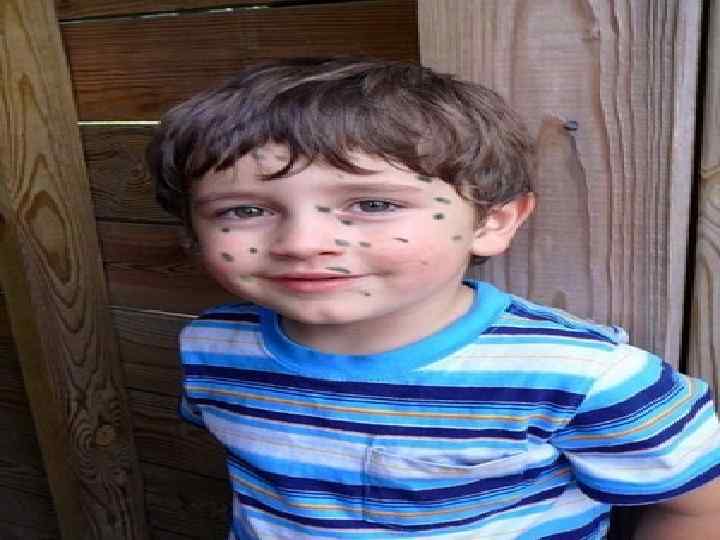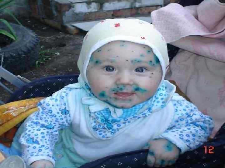 Ветрянка начинается с повышения температуры до 380 С, слабости. n На коже лица, волосистой части головы, туловище, слизистых оболочках (во рту, на половых органах) появляются красные пятна размерами до 5 -7 мм. Спустя несколько часов на их месте образуются волдыри, а затем — маленькие, точечные пузырьки с прозрачным содержимым. Через один-два дня они покрываются корочками, которые, отпадая, не оставляют следа. n Появление новых высыпаний (в течение 3 -8 суток) и трансформация отдельных элементов сыпи происходят одновременно — поэтому на одном участке кожи можно видеть и пятна, и волдыри, и пузырьки, и корочки. n Сыпь сопровождается сильным зудом. При каждом новом высыпании отмечается подъем температуры тела, нарушается самочувствие ребенка. Расчесывание высыпаний и сдирание корочек может привести n