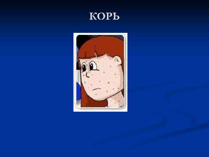 n n Корь — инфекционное заболевание, которое вызывается вирусом кори. Вероятность заражения непереболевшего корью человека при контакте с больным приближается к 100%. Чаще всего болеют дети дошкольного и школьного возраста. Источником инфекции является больной человек. Больной заразен за 4 -6 дней до появления сыпи и в первые 4 дня высыпаний. Инфекция передается воздушнокапельным путем — при кашле, чихании, разговоре и даже при дыхании. Возможен также вертикальный путь передачи кори — от беременной женщины плоду.